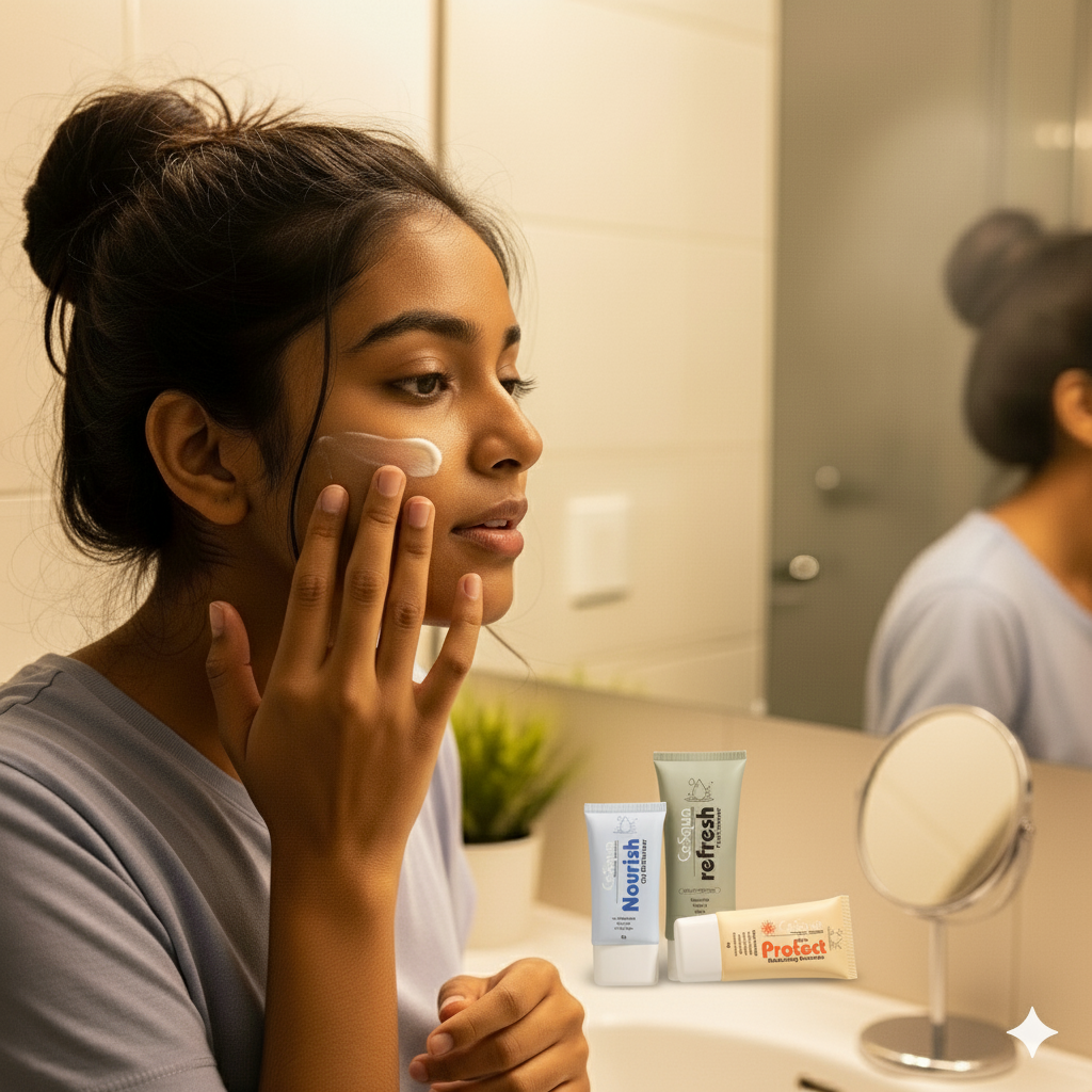 Step 1: Refresh & Cleanse: The facewash creates the perfect canvas by gently purifying the skin and preparing it to absorb maximum hydration.