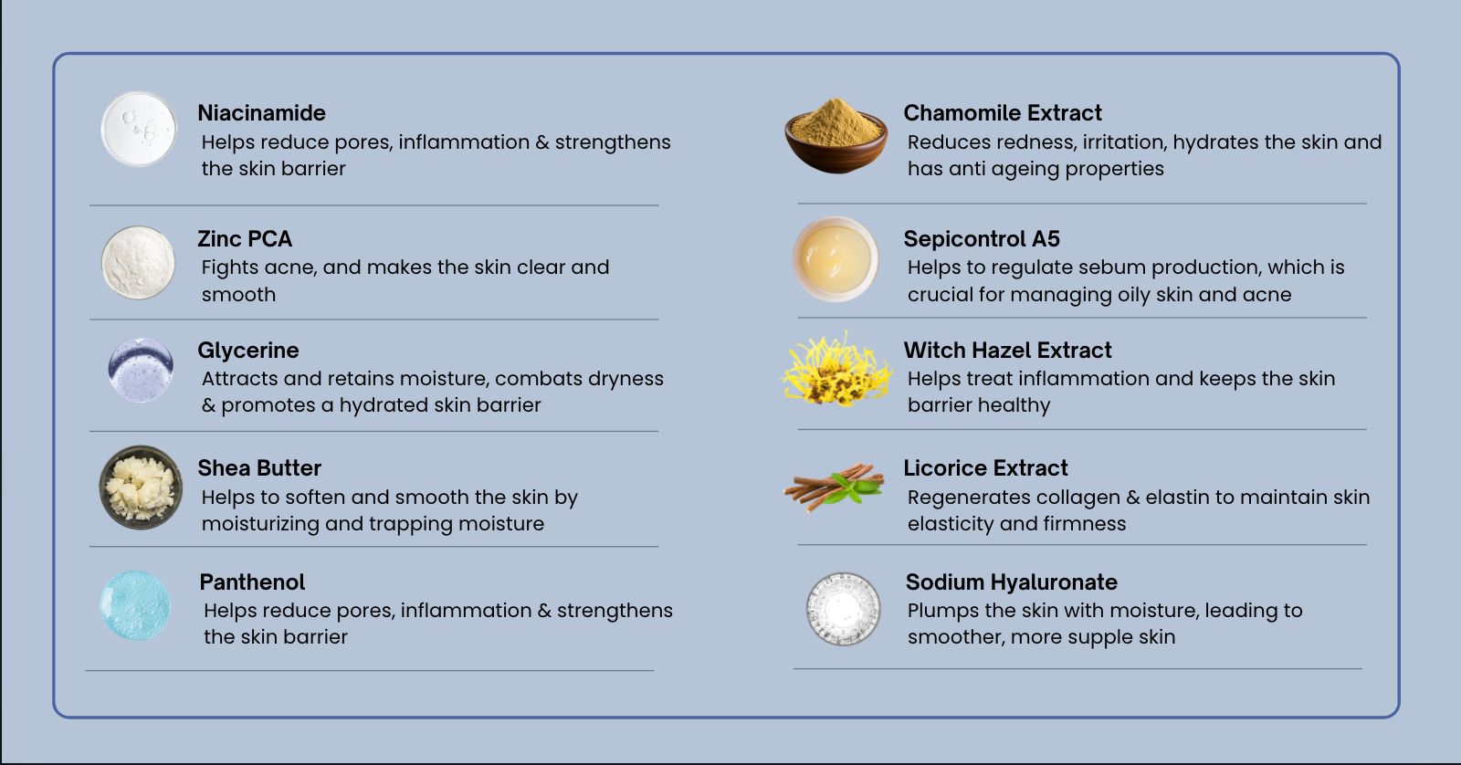 - Niacinamide + Zinc PCA tighten your pores and keep oil in check, without drying you out